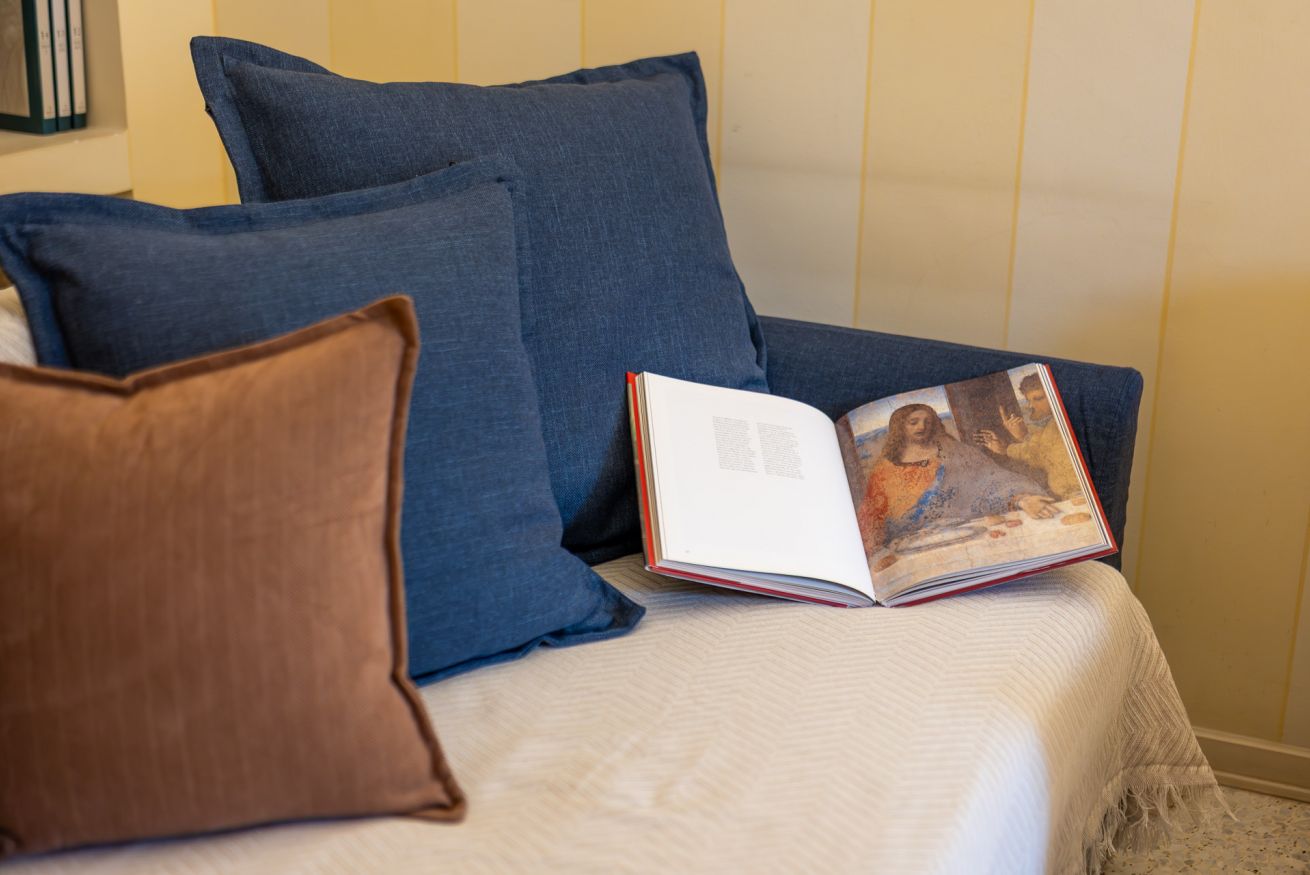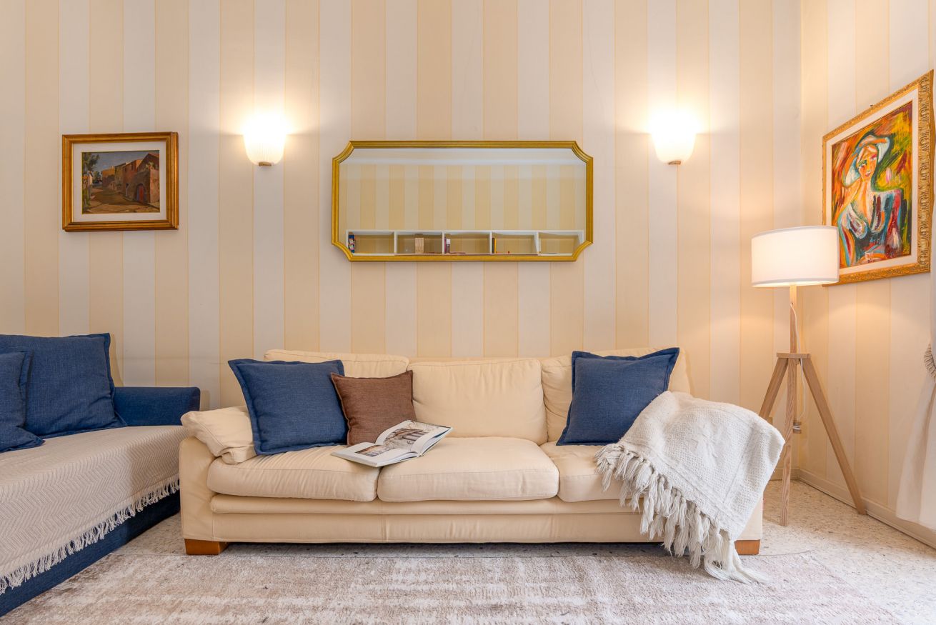 Il grande soggiorno è uno degli ambienti più piacevoli dell’appartamento: uno spazio accogliente e molto luminoso grazie alle ampie finestre e all’accesso al balcone. Qui potrai rilassarti dopo una giornata in città sul comodo divano, che all’occorrenza si trasforma in un pratico divano letto per due ospiti aggiuntivi.