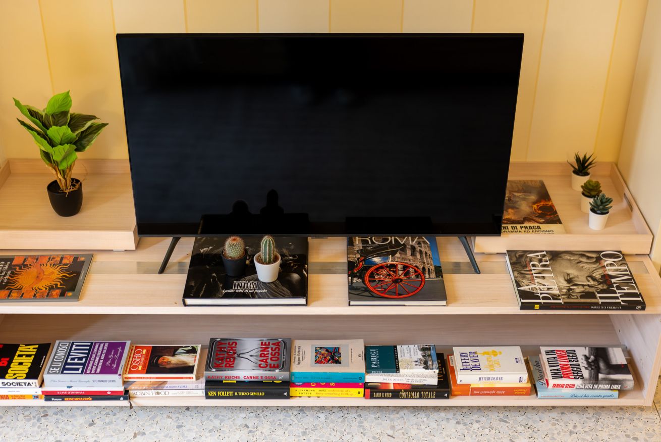 La zona living è arricchita da librerie, arredi curati e una Smart TV, creando un ambiente perfetto per guardare un film, leggere o semplicemente godersi un momento di relax.