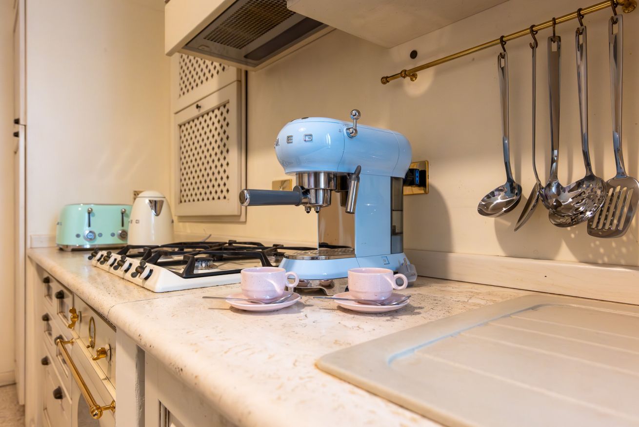 Troverai tutto il necessario per preparare colazioni tranquille o cene in appartamento: piano cottura, forno, frigorifero con freezer e diversi piccoli elettrodomestici utili come bollitore, tostapane e macchina del caffè.