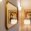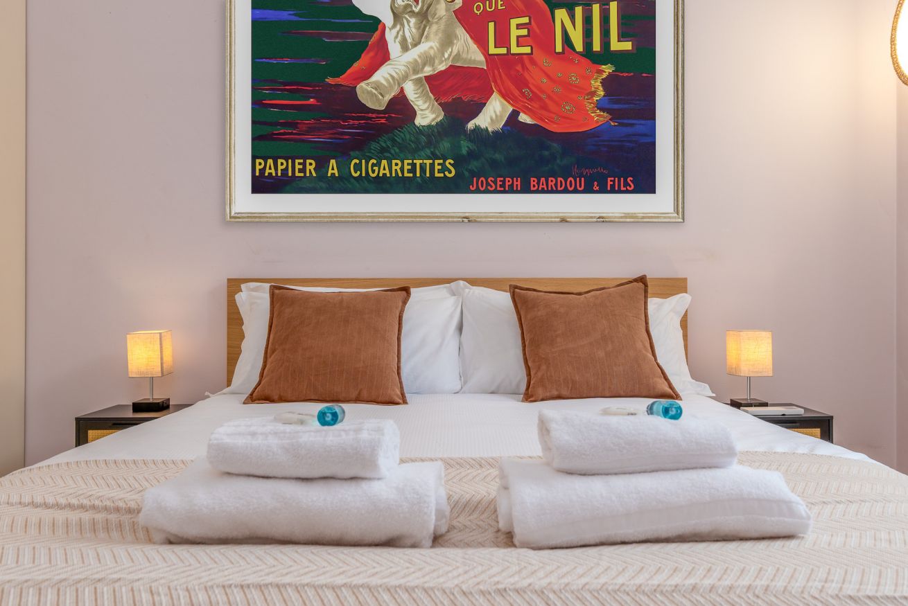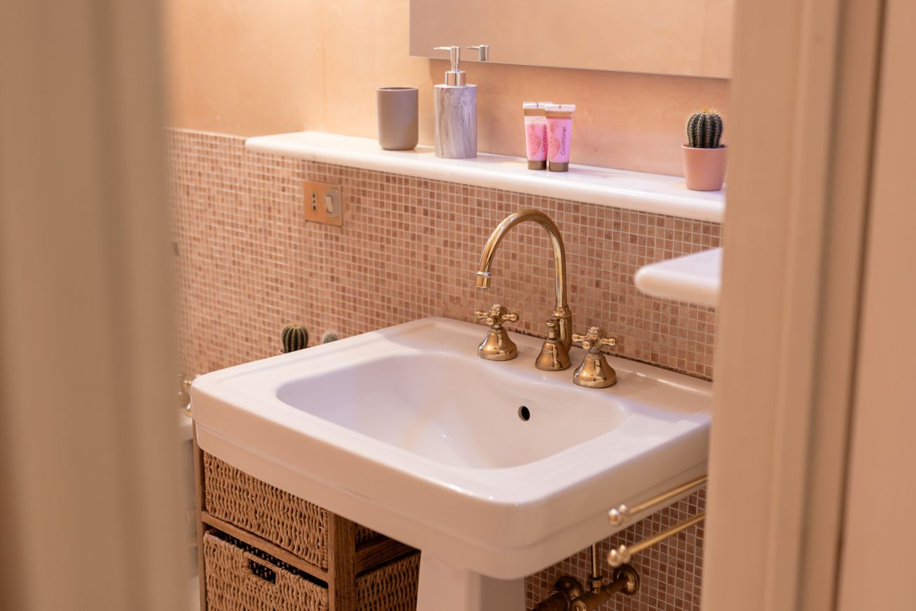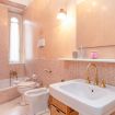 Il bagno è ampio e dotato di vasca da bagno, perfetta per rilassarsi dopo una lunga giornata in città. Sono presenti WC, bidet, lavandino spazioso e un grande specchio con illuminazione calda che rende l’ambiente accogliente e funzionale.