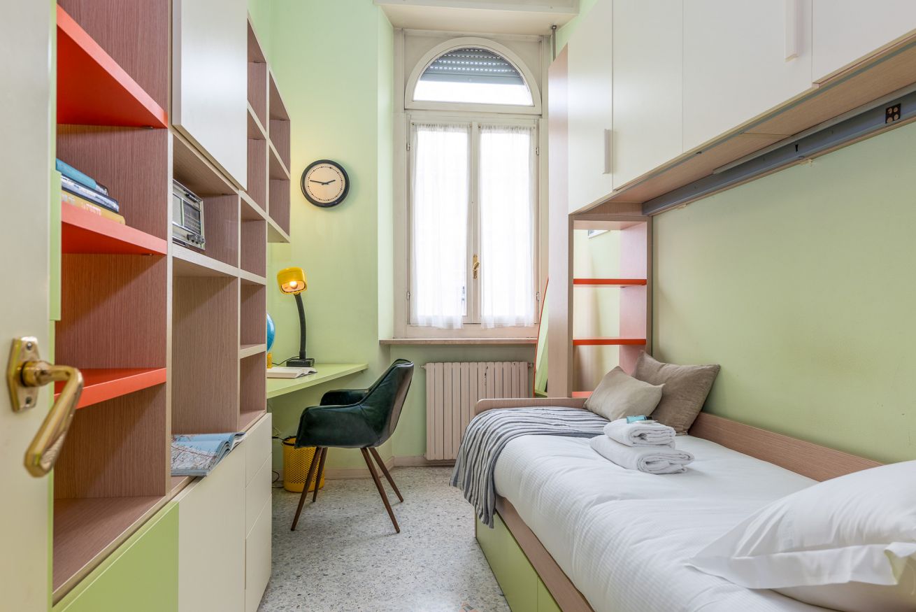 La seconda camera è una stanza singola luminosa e funzionale, perfetta sia per un ospite aggiuntivo sia per chi ha bisogno di uno spazio per lavorare.