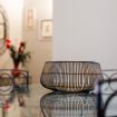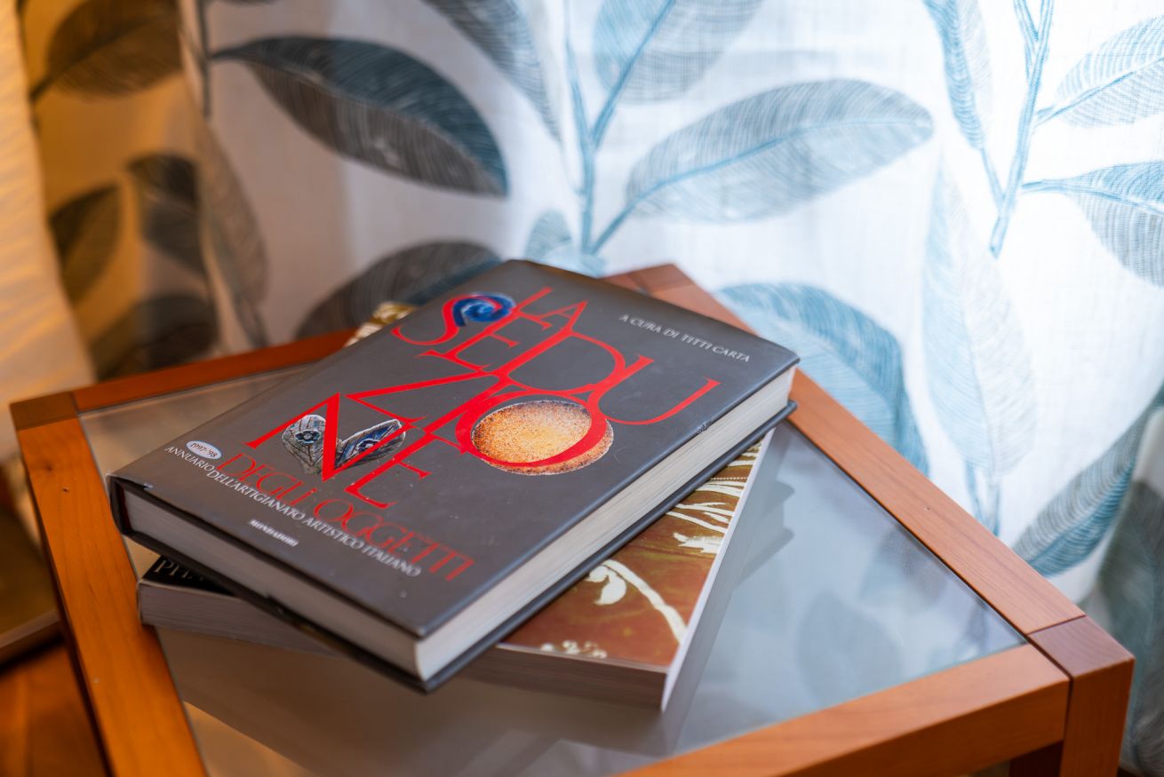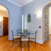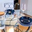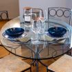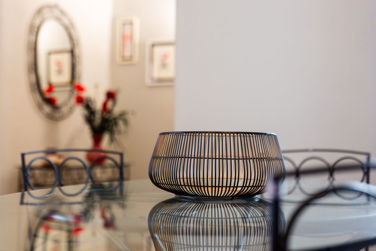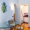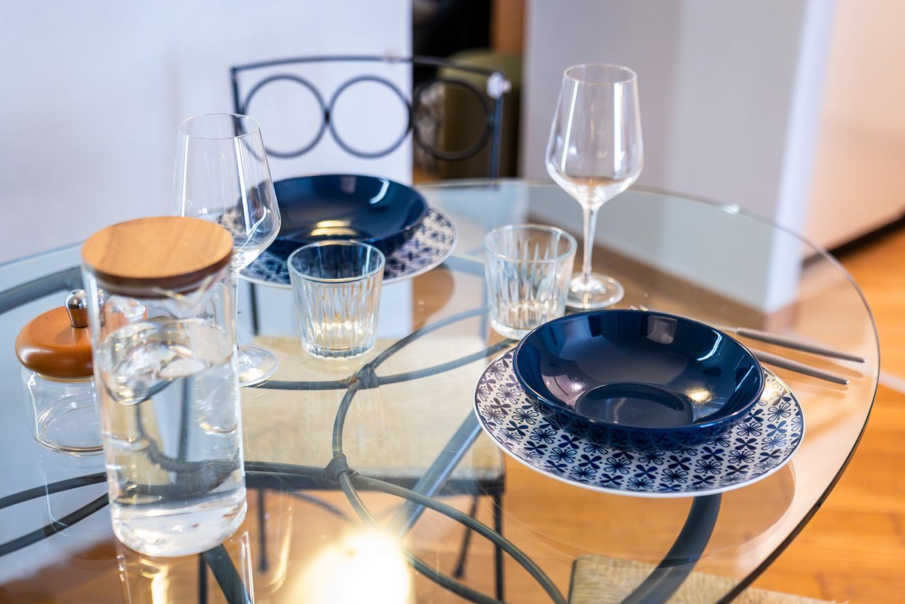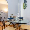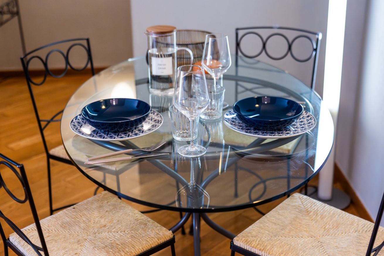 - Un tavolo da pranzo rotondo in ferro e vetro con sedie intrecciate, posizionato nel cuore dell'appartamento tra le due stanze — perfetto per colazioni calme o cene in casa