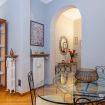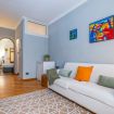 L'appartamento si sviluppa in modo fluido tra i suoi ambienti, collegati da eleganti arcate a tutto sesto che gli regalano un fascino tutto milanese. I pavimenti in parquet chiaro scaldano ogni stanza, e la palette di colori tenui — azzurro polvere, bianco e legno naturale — crea un'atmosfera rilassante dal primo sguardo.