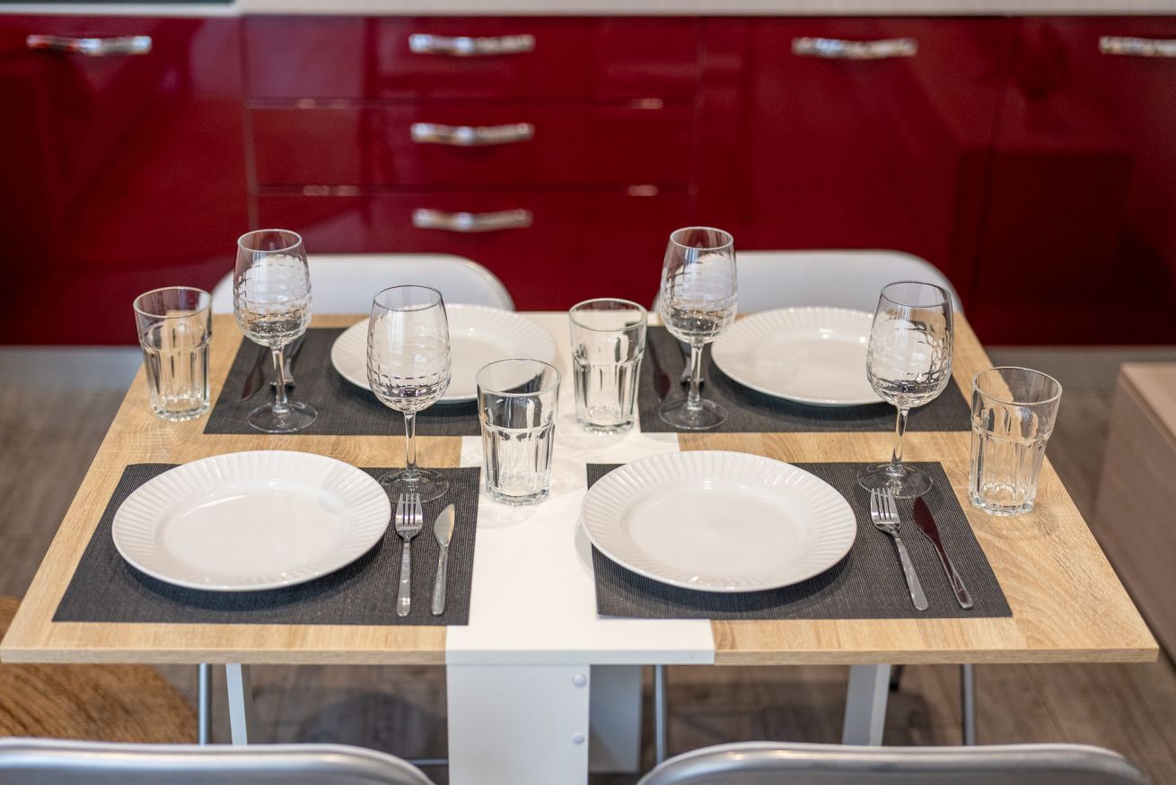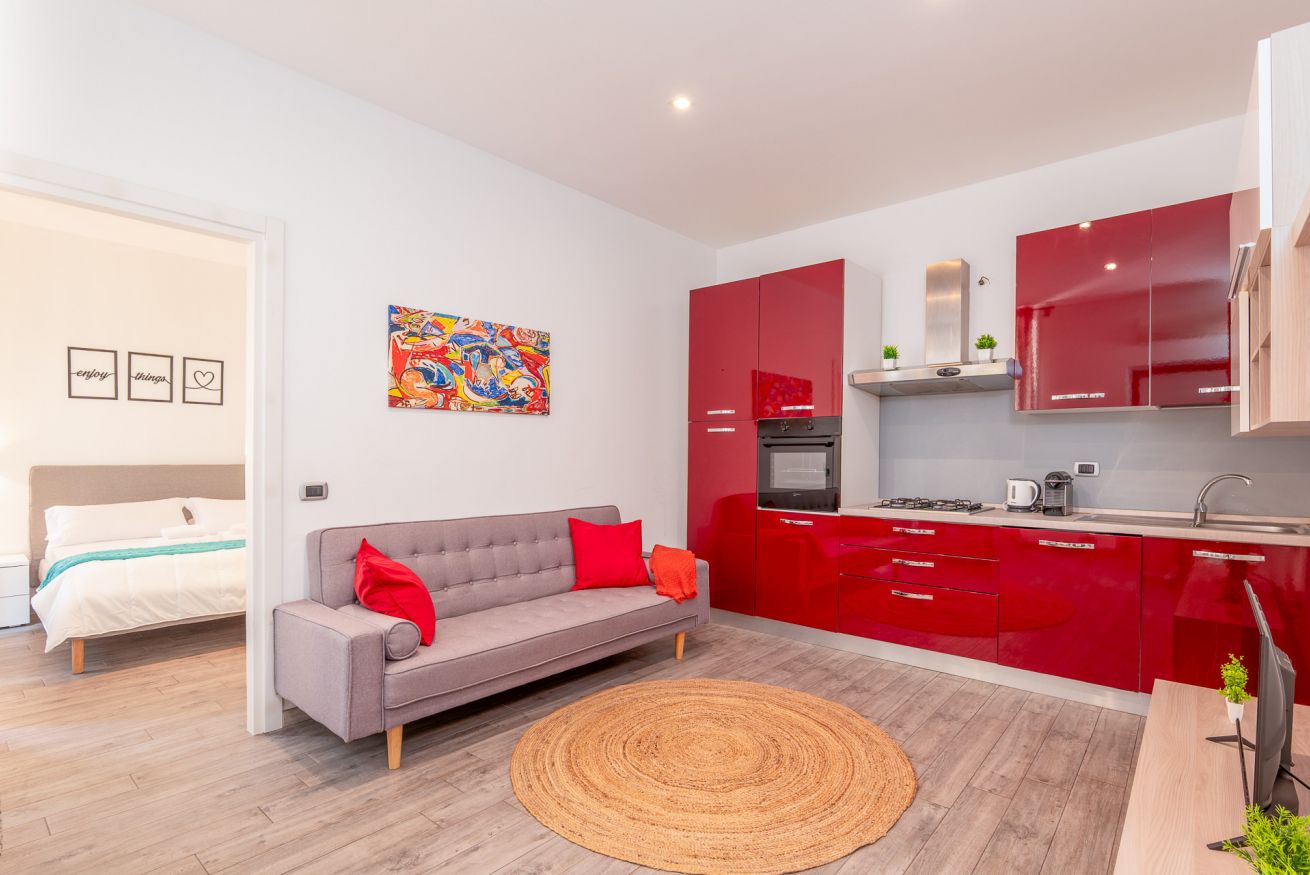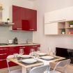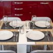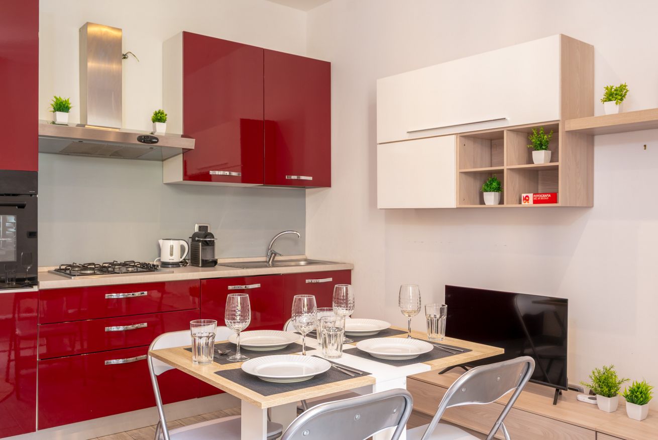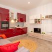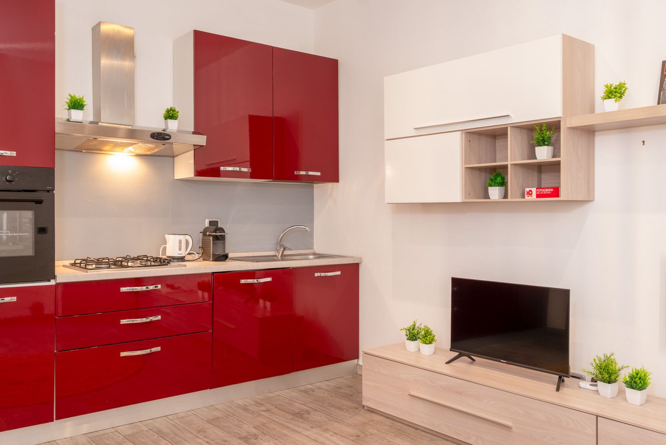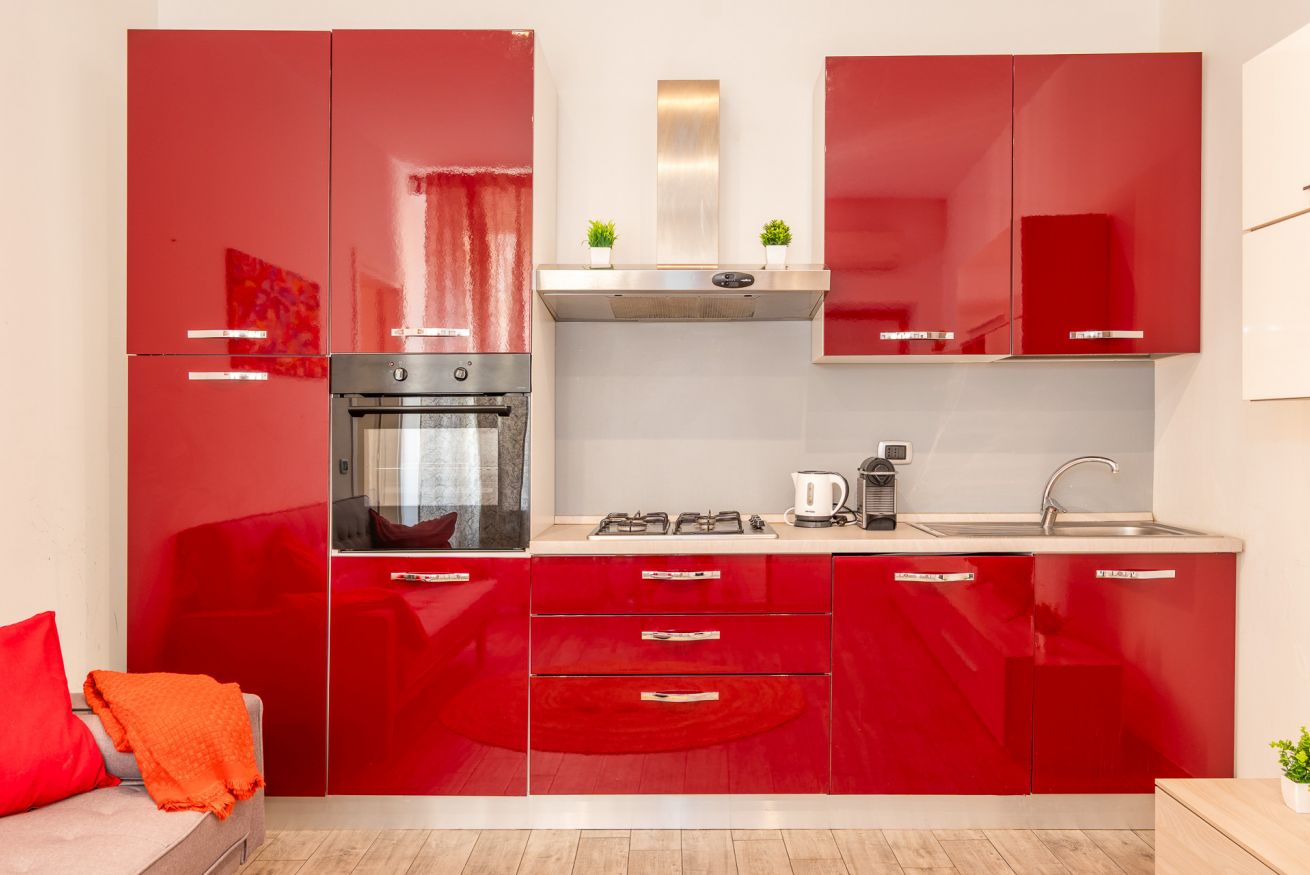 🍽️ Cucina moderna attrezzata open space dal design elegante, con mobili laccati bordeaux e tutto il necessario per cucinare: forno, fornelli, macchina caffè e bollitore.