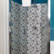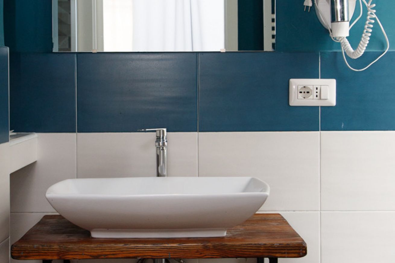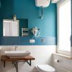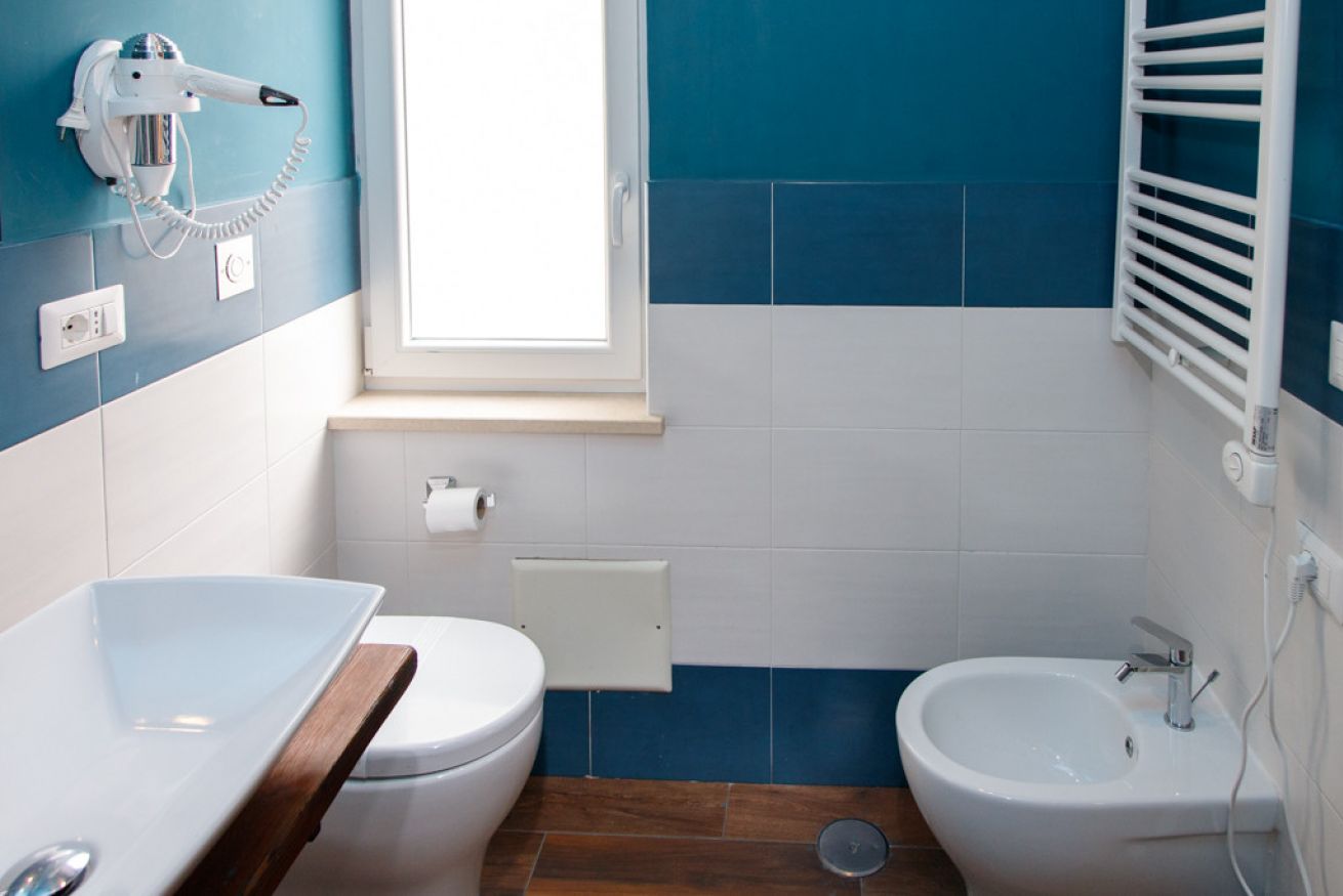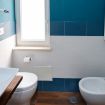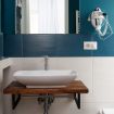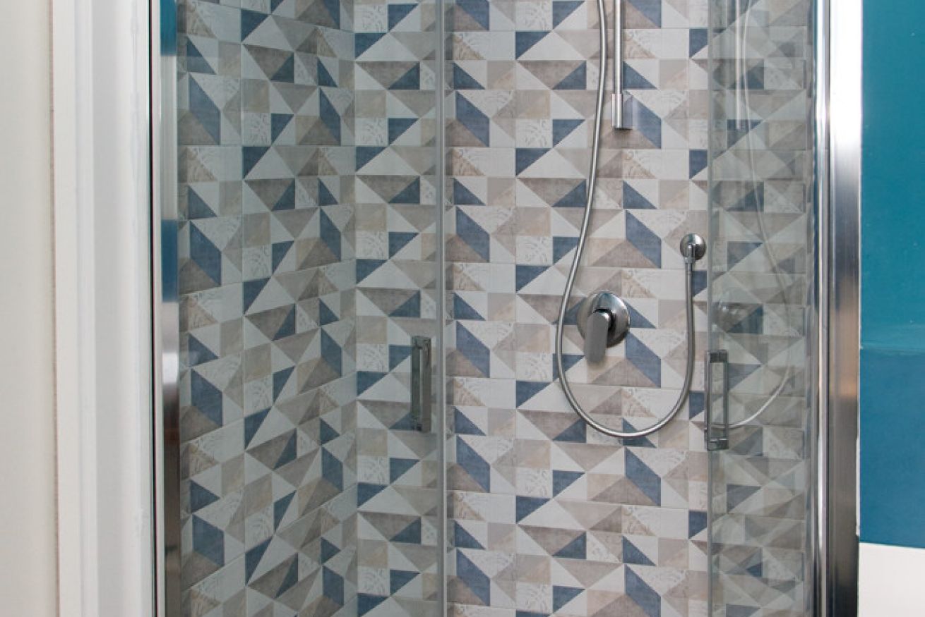 Pareti in blu petrolio intenso, pavimento in granigliato effetto cotto, doccia con box in vetro e piastrelle geometriche dai toni grigio-beige. Un design ricercato e originale che trasmette cura in ogni dettaglio. Completo di WC, bidet, lavandino su piano in legno massello con rubinetteria cromata, specchio illuminato e asciugacapelli.