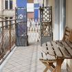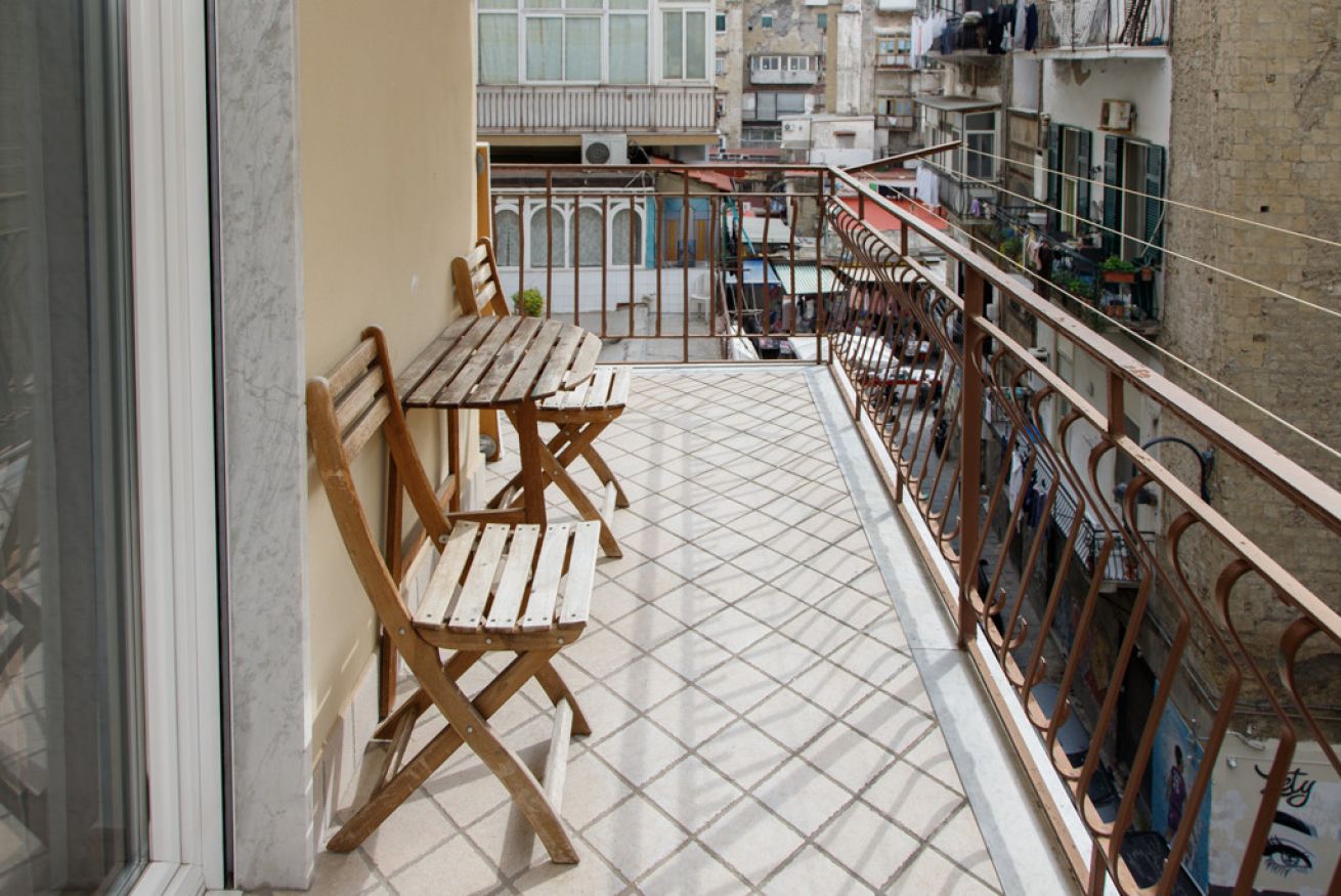 La camera ha accesso diretto a un balcone spaziato e luminoso, arredato con tavolo e sedie in legno dove fare colazione al sole o godersi un aperitivo al tramonto, con il sottofondo vivo e autentico della città. Un affaccio urbano napoletano doc: palazzi storici, voci di strada e tutta quell'energia inconfondibile.