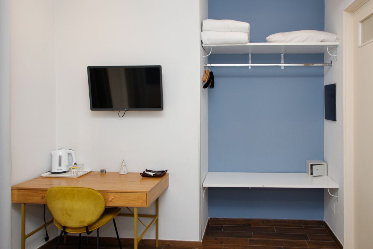 Troverai una scrivania in legno con sedia dal design contemporaneo e una TV a schermo piatto a parete — perfetta sia per chi vuole lavorare qualche ora che per chi preferisce rilassarsi con una serie.