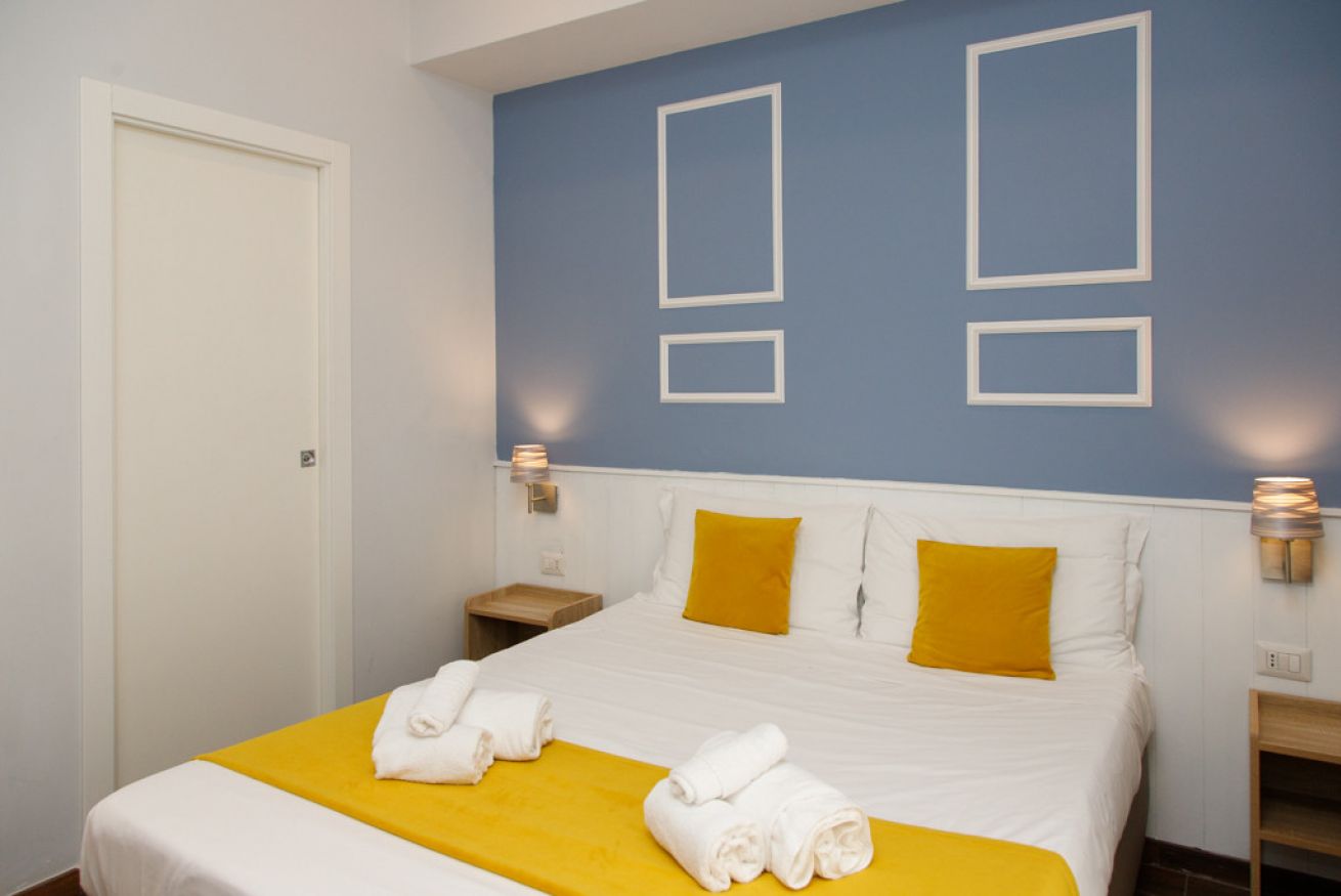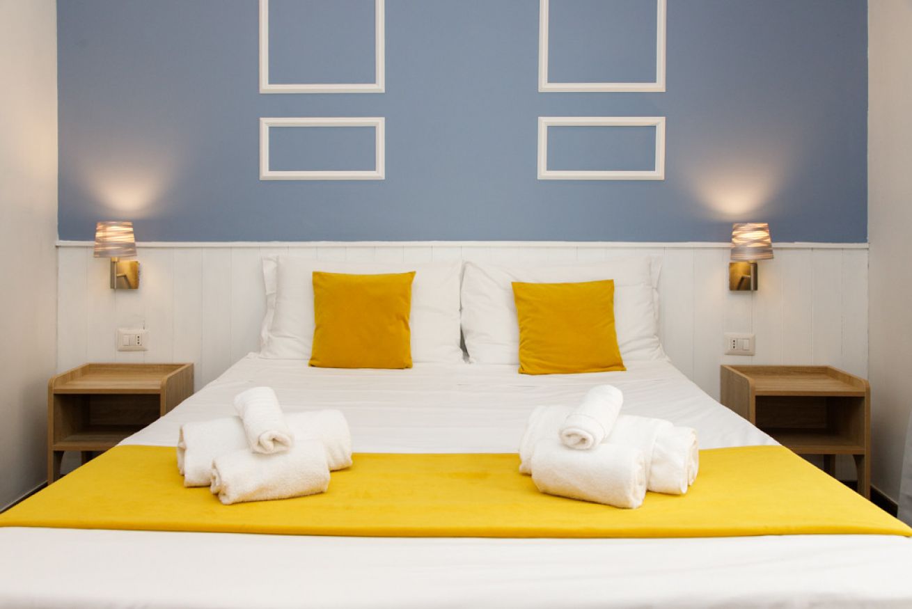 La camera matrimoniale si distingue per un design moderno e allegro: la parete testata è dipinta in blu cielo con decorazioni geometriche bianche che incorniciano il letto, creando un'atmosfera fresca, curata e tutt'altro che anonima.