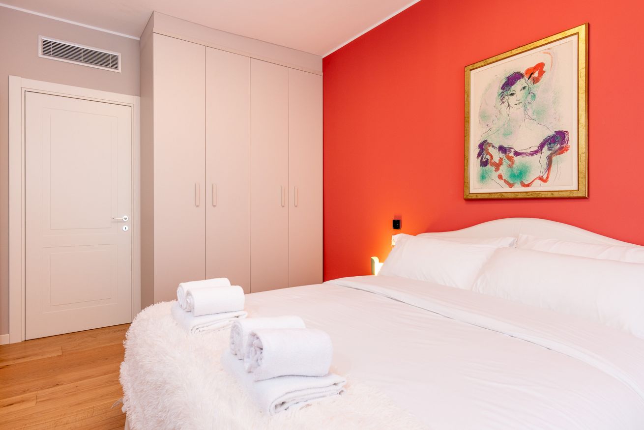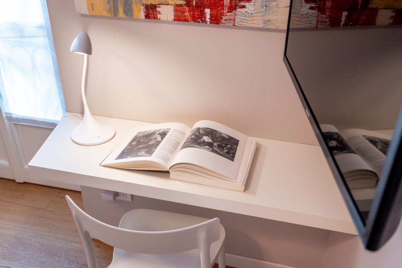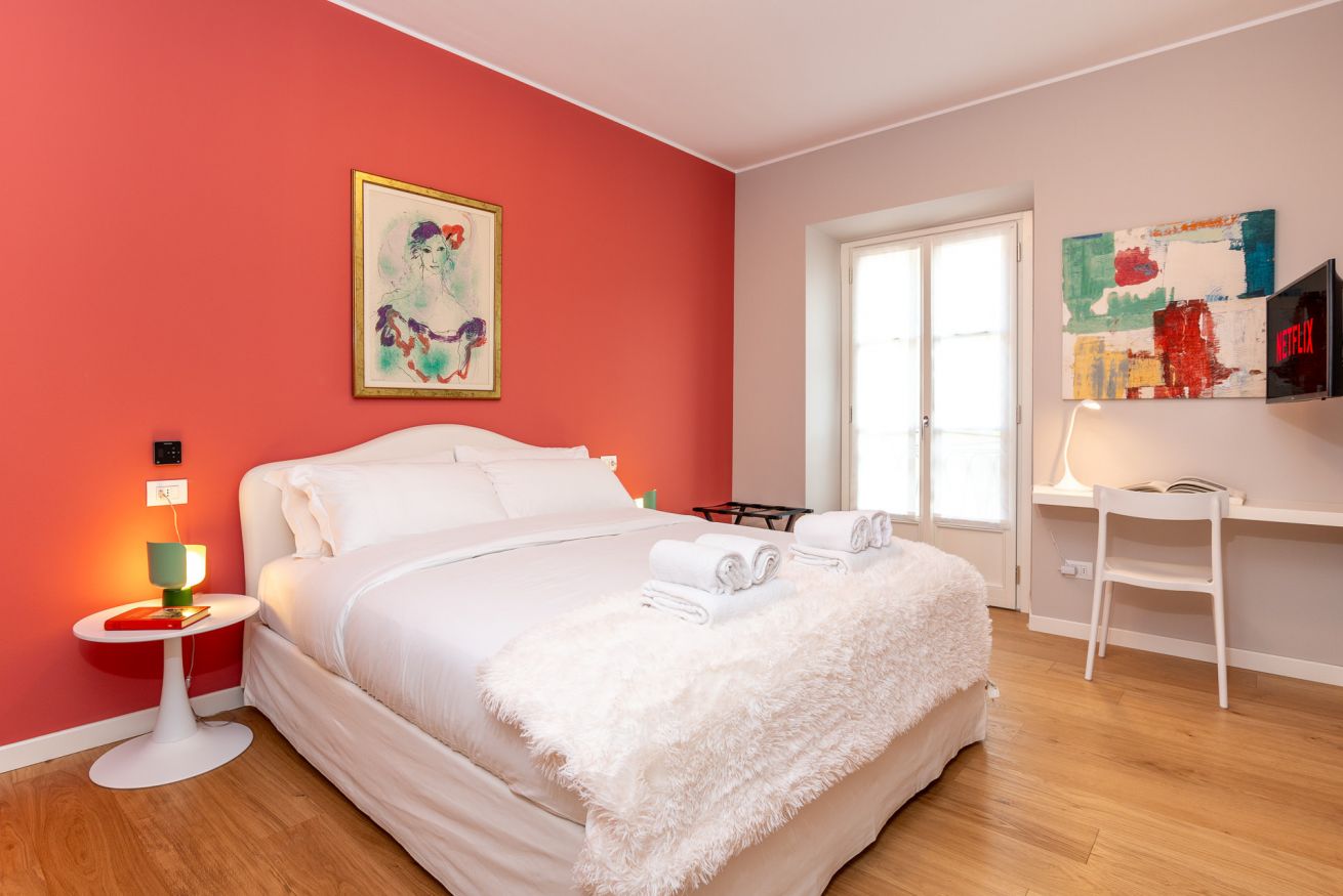 Camera Principale: Un lussuoso letto matrimoniale, una piccola scrivania e arredi raffinati per un soggiorno riposante e produttivo.